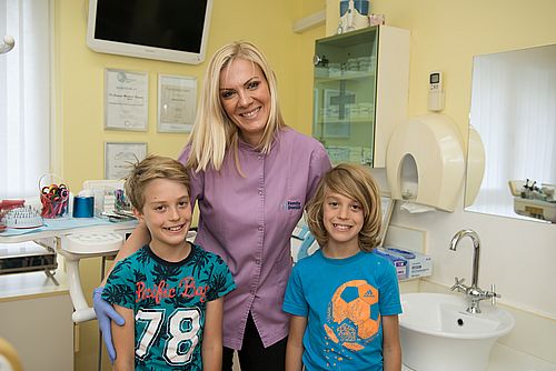 Deca se ne rađaju sa strahom od stomatologa, ali imaju strah od nepoznatog .Zato je važno da prve posete budu prijatno iskustvo kojeg će se deca rado sećati kako bi nam poklonila poverenje u budućim posetama. Dete se upoznaje sa instrumentima i radnim mestom, dozvoljava mu se da pipne i oseti sve što ćemo koristiti u radu. Naš tim lekara ulaže trud i posvećenost malim pacijentima kako bi opisali deci tretman koji treba da sprovedemo. Kada je u pitanju lečenje mlečnih zuba koristimo lekove i materijale poslednjih genercija koji se između ostalog odlikuju osobinama koje nam omogućavaju efikasniji rad sa decom.